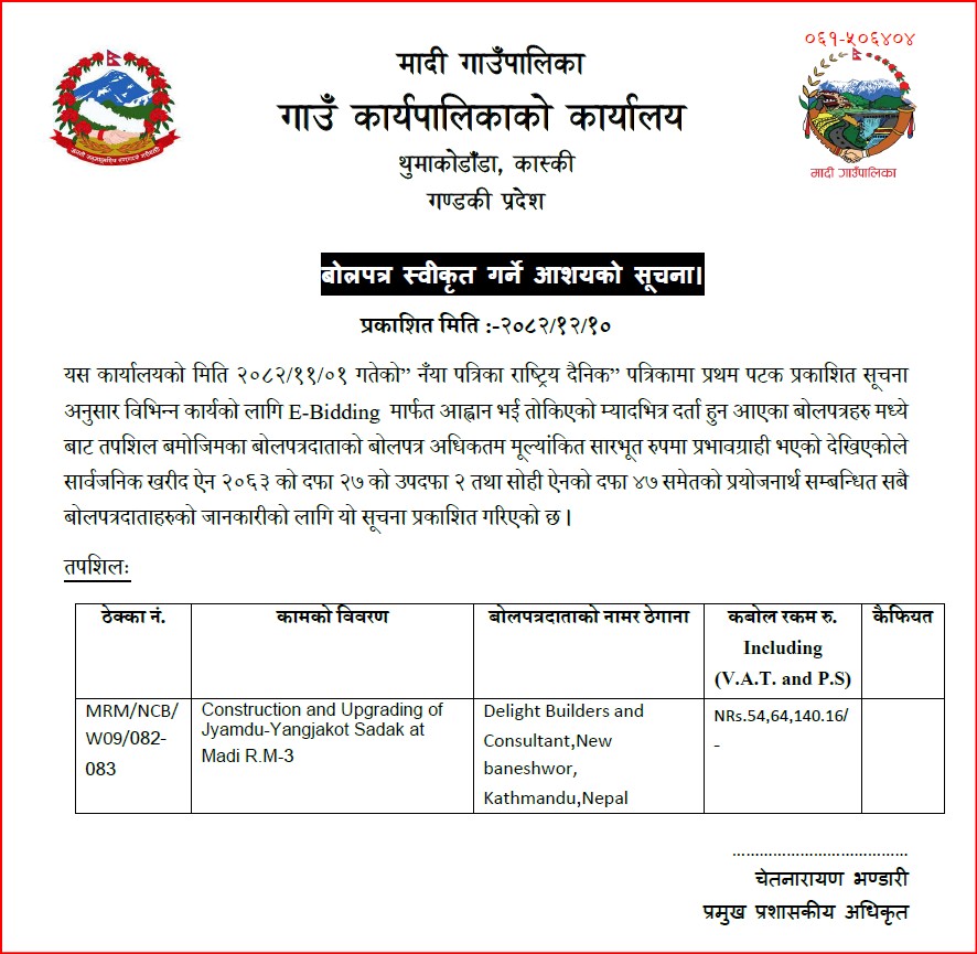 बोलपत्र स्वीकृत गर्ने आशयको सूचना।